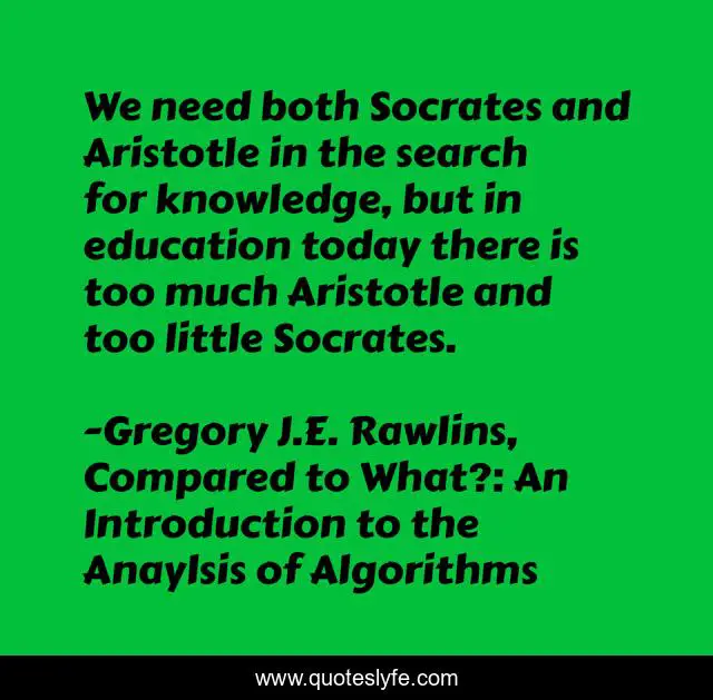 This page presents the quote "We need both Socrates and Aristotle in the search for knowledge, but in education today there is too much Aristotle and too little Socrates.". Author of this quote is Gregory J.E. Rawlins, Compared to What?: An Introduction to the Anaylsis of Algorithms. This quote is about education, learning, philosophy,.