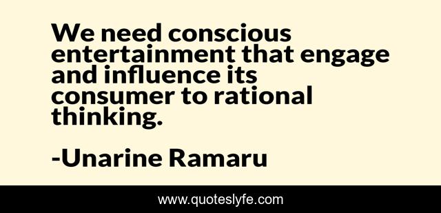 This page presents the quote "We need conscious entertainment that engage and influence its consumer to rational thinking.". Author of this quote is Unarine Ramaru. This quote is about arts, engage, entertainment, influence, rational-thinking, music,.