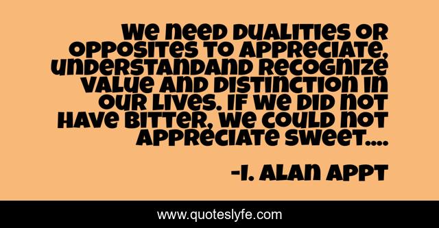 This page presents the quote "We need dualities or opposites to appreciate, understandand recognize value and distinction in our lives. If we did not have bitter, we could not appreciate sweet....". Author of this quote is I. Alan Appt. This quote is about spirituality, self, philosophy, psychology,.