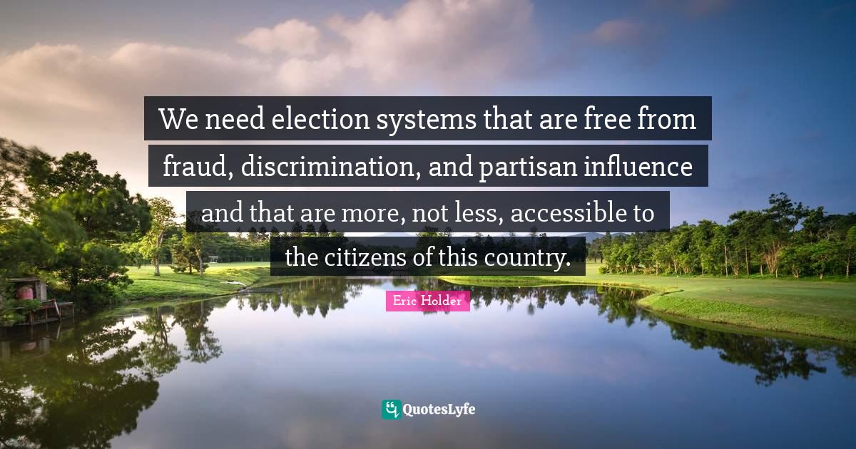 This page presents the quote "We need election systems that are free from fraud, discrimination, and partisan influence and that are more, not less, accessible to the citizens of this country.". Author of this quote is Eric Holder. This quote is about country, election, citizens, influence, fraud, discrimination,.