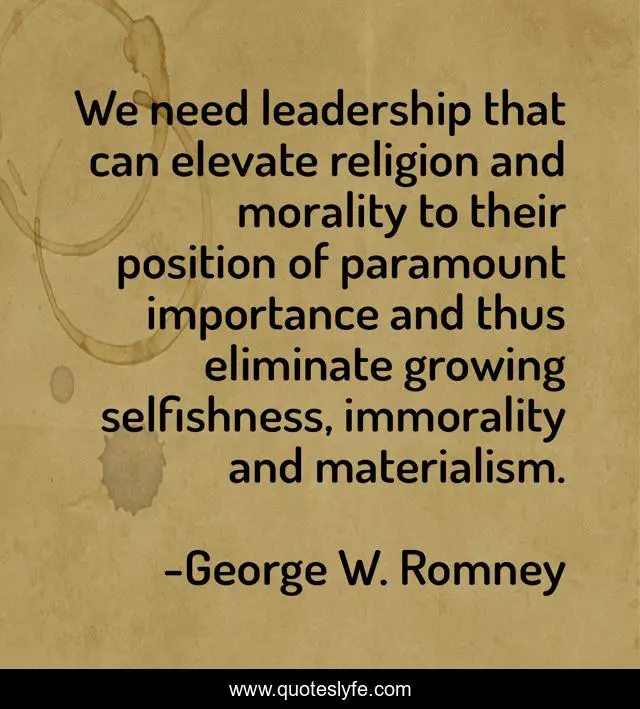 This page presents the quote "We need leadership that can elevate religion and morality to their position of paramount importance and thus eliminate growing selfishness, immorality and materialism.". Author of this quote is George W. Romney. This quote is about leadership, morality,.