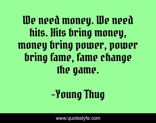 This page presents the quote "We need money. We need hits. Hits bring money, money bring power, power bring fame, fame change the game.". Author of this quote is Young Thug. This quote is about money, game, change,.