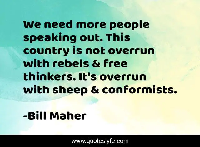 This page presents the quote "We need more people speaking out. This country is not overrun with rebels & free thinkers. It's overrun with sheep & conformists.". Author of this quote is Bill Maher. This quote is about politics, conformists,.