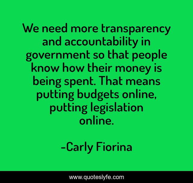 This page presents the quote "We need more transparency and accountability in government so that people know how their money is being spent. That means putting budgets online, putting legislation online.". Author of this quote is Carly Fiorina. This quote is about money, accountability,.