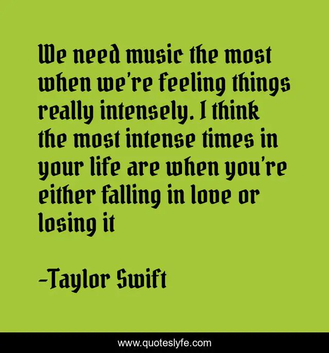 This page presents the quote "We need music the most when we’re feeling things really intensely. I think the most intense times in your life are when you’re either falling in love or losing it". Author of this quote is Taylor Swift. This quote is about feeling, love, affection, song,.