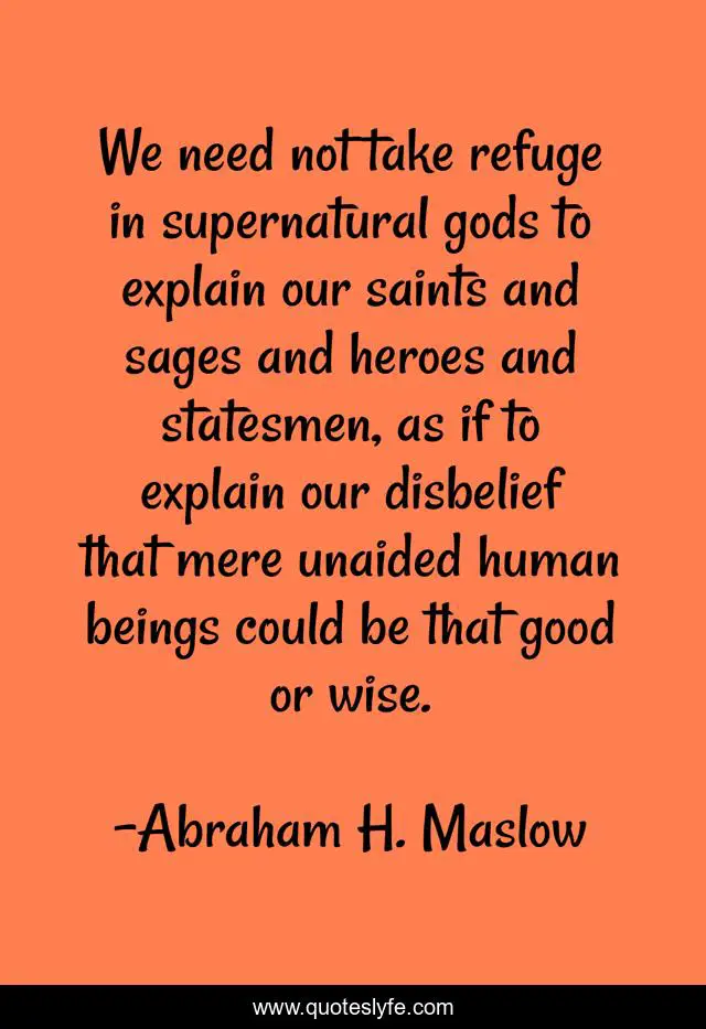 This page presents the quote "We need not take refuge in supernatural gods to explain our saints and sages and heroes and statesmen, as if to explain our disbelief that mere unaided human beings could be that good or wise.". Author of this quote is Abraham H. Maslow. This quote is about good, wise, disbelief, gods, explain, sages, superstition, supernatural, heroes,.