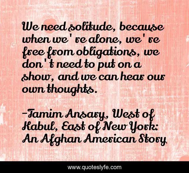 This page presents the quote "We need solitude, because when we're alone, we're free from obligations, we don't need to put on a show, and we can hear our own thoughts.". Author of this quote is Tamim Ansary, West of Kabul, East of New York: An Afghan American Story. This quote is about alone, solitude, alone-time,.