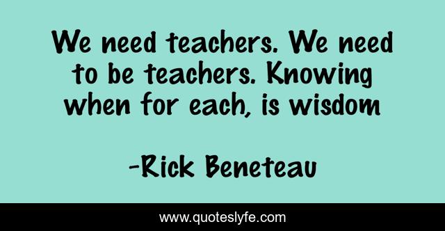 This page presents the quote "We need teachers. We need to be teachers. Knowing when for each, is wisdom". Author of this quote is Rick Beneteau. This quote is about wisdom-inspirational, teachers, wisdom,.