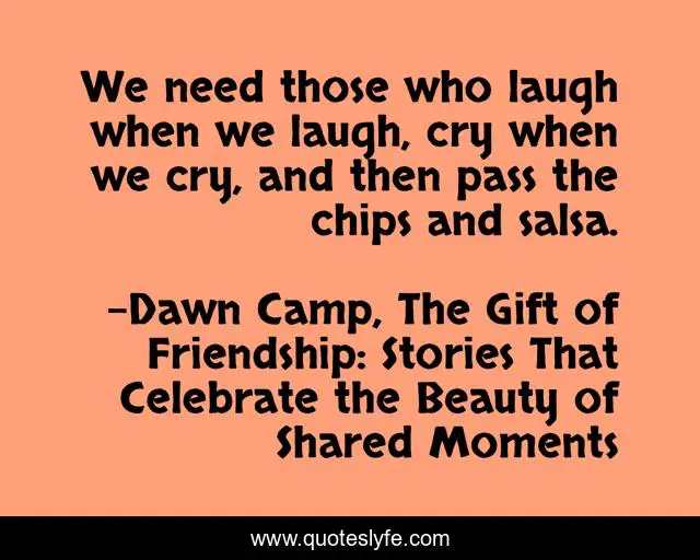 This page presents the quote "We need those who laugh when we laugh, cry when we cry, and then pass the chips and salsa.". Author of this quote is Dawn Camp, The Gift of Friendship: Stories That Celebrate the Beauty of Shared Moments. .