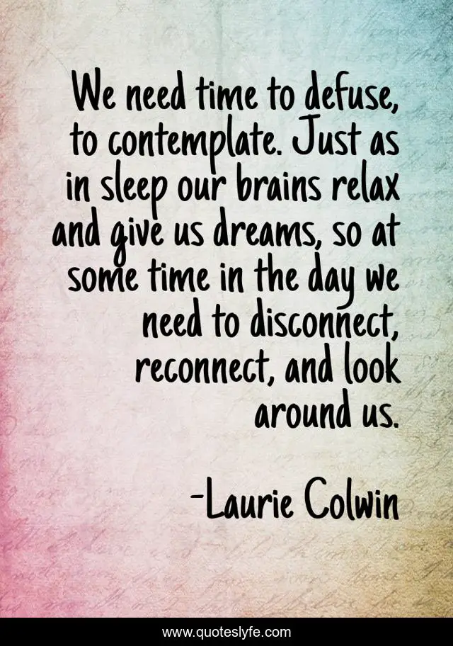 "Laurie Colwin Quotes." Quoteslyfe.com, 2025. Fri. 05 Dec. 2025. <https://www.quoteslyfe.com/quote/We-need-time-to-defuse-to-contemplate-284169>.