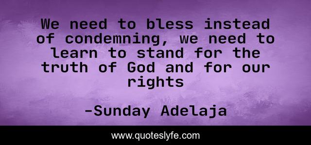 This page presents the quote "We need to bless instead of condemning, we need to learn to stand for the truth of God and for our rights". Author of this quote is Sunday Adelaja. This quote is about rights, god, condemning, bless, national-transformation, stand, truth, learn, need,.