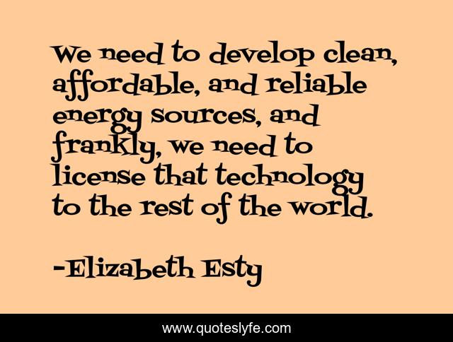 This page presents the quote "We need to develop clean, affordable, and reliable energy sources, and frankly, we need to license that technology to the rest of the world.". Author of this quote is Elizabeth Esty. This quote is about world, energy, rest,.
