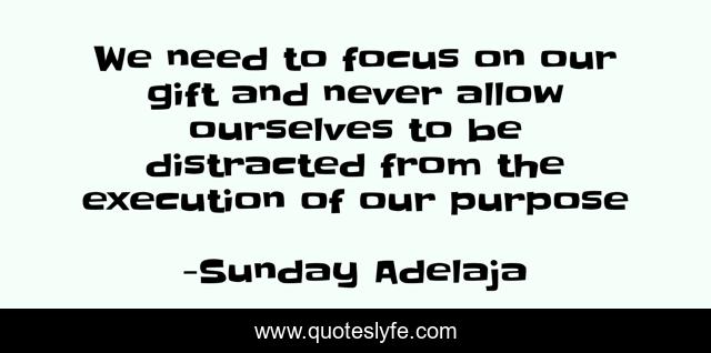 This page presents the quote "We need to focus on our gift and never allow ourselves to be distracted from the execution of our purpose". Author of this quote is Sunday Adelaja. This quote is about gift, focus, famous, purpose, greatness, distraction,.