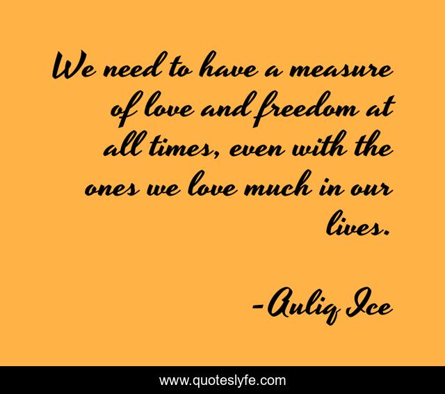 This page presents the quote "We need to have a measure of love and freedom at all times, even with the ones we love much in our lives.". Author of this quote is Auliq Ice. This quote is about internet-privacy, internet-security, internet-dating, falling-in-love, love, private-emotions-trilogy, privacy, online-security, private-emotions,.
