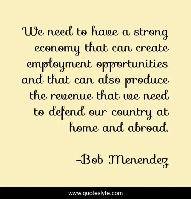 This page presents the quote "We need to have a strong economy that can create employment opportunities and that can also produce the revenue that we need to defend our country at home and abroad.". Author of this quote is Bob Menendez. This quote is about strong, opportunities,.