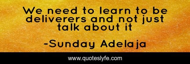 This page presents the quote "We need to learn to be deliverers and not just talk about it". Author of this quote is Sunday Adelaja. This quote is about need, national-transformation, talk, deliverers, learn,.