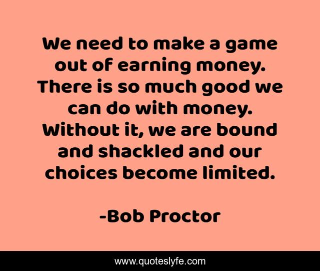 This page presents the quote "We need to make a game out of earning money. There is so much good we can do with money. Without it, we are bound and shackled and our choices become limited.". Author of this quote is Bob Proctor. This quote is about personal-achievement, personal-growth, self-development, self-improvement, self-help, personal-development,.