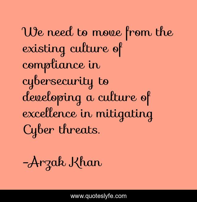 This page presents the quote "We need to move from the existing culture of compliance in cybersecurity to developing a culture of excellence in mitigating Cyber threats.". Author of this quote is Arzak Khan. This quote is about cybersecurity, culture, internet,.
