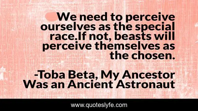 This page presents the quote "We need to perceive ourselves as the special race.If not, beasts will perceive themselves as the chosen.". Author of this quote is Toba Beta, My Ancestor Was an Ancient Astronaut. This quote is about beast, chosen, human, special, mind-set,.