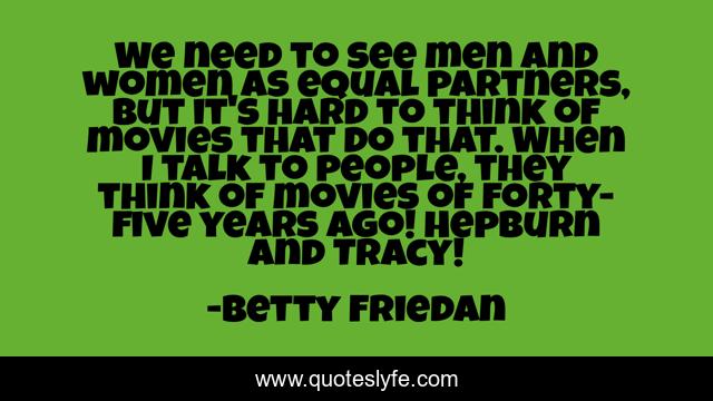 This page presents the quote "We need to see men and women as equal partners, but it's hard to think of movies that do that. When I talk to people, they think of movies of forty-five years ago! Hepburn and Tracy!". Author of this quote is Betty Friedan. This quote is about men, think, people,.