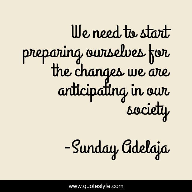 This page presents the quote "We need to start preparing ourselves for the changes we are anticipating in our society". Author of this quote is Sunday Adelaja. This quote is about society, start, national-transformation, anticipating, need, changes, preparing,.