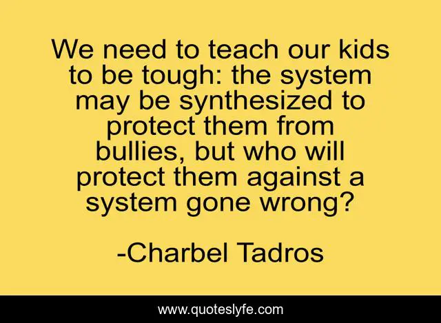 This page presents the quote "We need to teach our kids to be tough: the system may be synthesized to protect them from bullies, but who will protect them against a system gone wrong?". Author of this quote is Charbel Tadros. This quote is about kids, bully, system, protection, teach, children,.