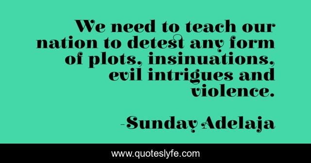 This page presents the quote "We need to teach our nation to detest any form of plots, insinuations, evil intrigues and violence.". Author of this quote is Sunday Adelaja. This quote is about we, insinuations, intrigues, form, violence, evil, nation, detest, our,.