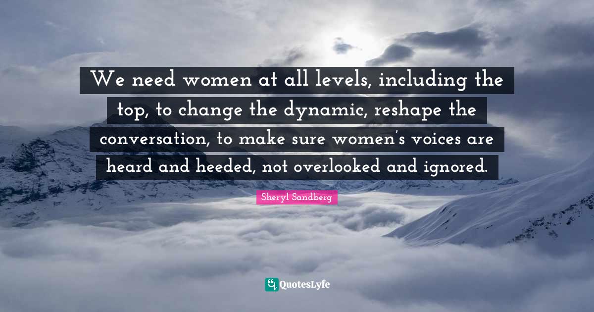 This page presents the quote "We need women at all levels, including the top, to change the dynamic, reshape the conversation, to make sure women’s voices are heard and heeded, not overlooked and ignored.". Author of this quote is Sheryl Sandberg. This quote is about voice, ignored, women, heard, overlooked, levels, including, conversation, motivational,.