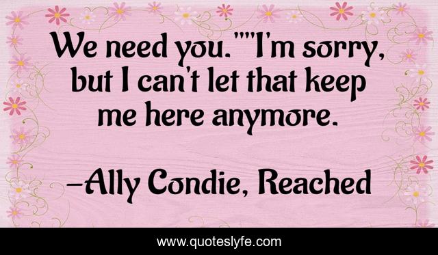 This page presents the quote "We need you.""I'm sorry, but I can't let that keep me here anymore.". Author of this quote is Ally Condie, Reached. This quote is about life, moving-on, personal-growth,.