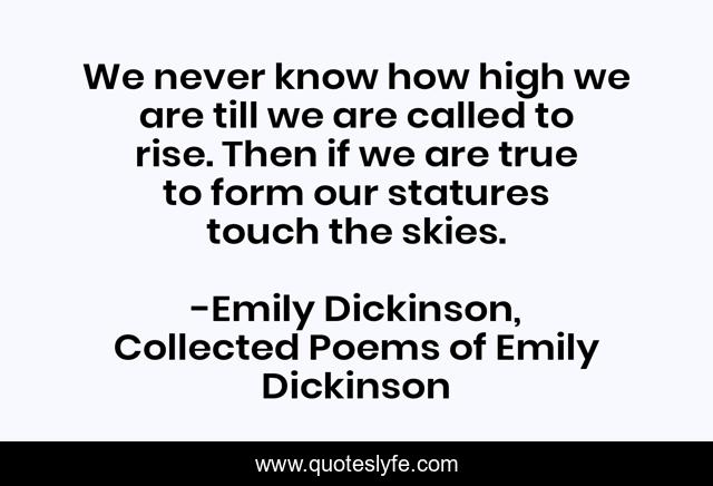 This page presents the quote "We never know how high we are till we are called to rise. Then if we are true to form our statures touch the skies.". Author of this quote is Emily Dickinson, Collected Poems of Emily Dickinson. This quote is about enthusiasm, inspirational,.