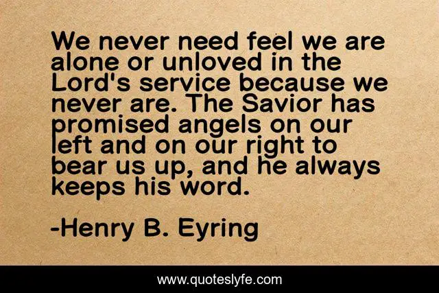 This page presents the quote "We never need feel we are alone or unloved in the Lord's service because we never are. The Savior has promised angels on our left and on our right to bear us up, and he always keeps his word.". Author of this quote is Henry B. Eyring. This quote is about right, angels, service,.