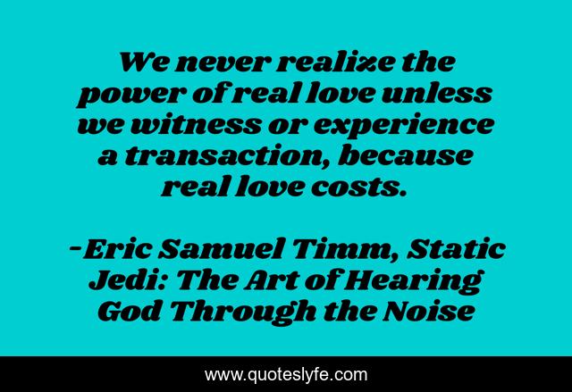 This page presents the quote "We never realize the power of real love unless we witness or experience a transaction, because real love costs.". Author of this quote is Eric Samuel Timm, Static Jedi: The Art of Hearing God Through the Noise. This quote is about real, love, confidence, transaction, christian, power, god, motivational, experience,.