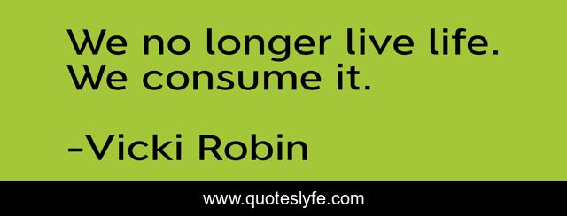 This page presents the quote "We no longer live life. We consume it.". Author of this quote is Vicki Robin. This quote is about money, consumerism,.