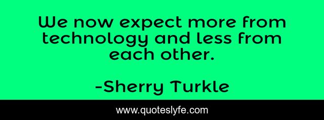 This page presents the quote "We now expect more from technology and less from each other.". Author of this quote is Sherry Turkle. This quote is about technology, psychology,.