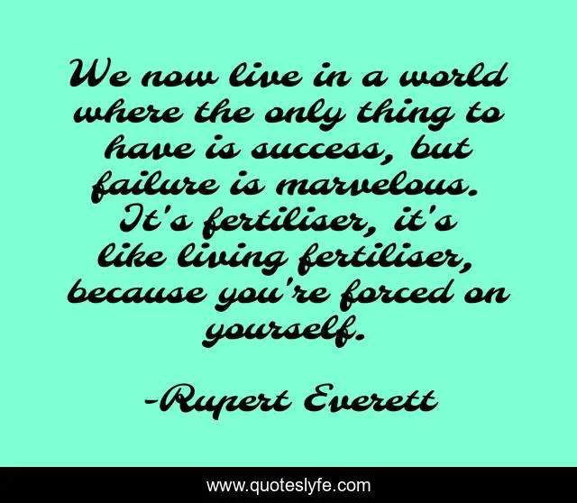 This page presents the quote "We now live in a world where the only thing to have is success, but failure is marvelous. It's fertiliser, it's like living fertiliser, because you're forced on yourself.". Author of this quote is Rupert Everett. This quote is about world, success, yourself,.