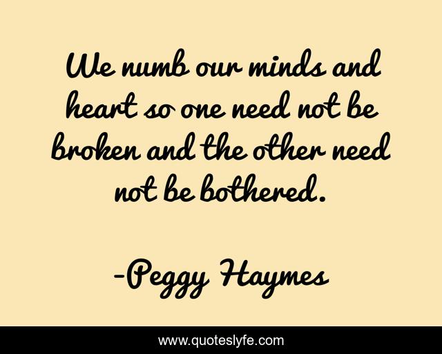 This page presents the quote "We numb our minds and heart so one need not be broken and the other need not be bothered.". Author of this quote is Peggy Haymes. This quote is about life, denial, compassion, confession, minds, hearts, numbing, avoidance,.