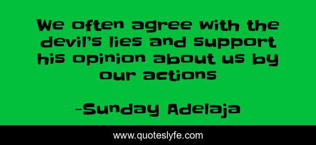 This page presents the quote "We often agree with the devil’s lies and support his opinion about us by our actions". Author of this quote is Sunday Adelaja. This quote is about devil, support, actions, lies, opinion, agree,.