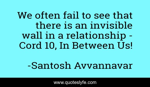 This page presents the quote "We often fail to see that there is an invisible wall in a relationship - Cord 10, In Between Us!". Author of this quote is Santosh Avvannavar. This quote is about cord, confidence, positive, aspiration, motivational, umbilical, optimistic, inspirational, enthusiasm,.