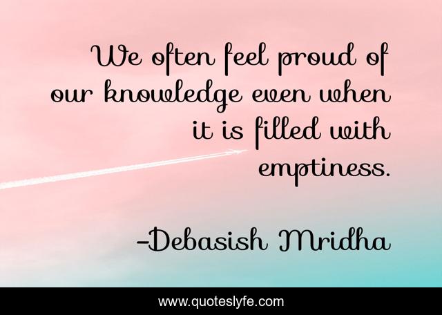 This page presents the quote "We often feel proud of our knowledge even when it is filled with emptiness.". Author of this quote is Debasish Mridha. This quote is about feel-proud, knowledge, philosophy, debasish-mridha, quotes, inspirational, filled-with-emptiness, enthusiasm, debasish-mridha-m-d,.