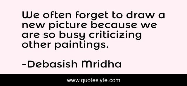 This page presents the quote "We often forget to draw a new picture because we are so busy criticizing other paintings.". Author of this quote is Debasish Mridha. This quote is about criticisim, philosophy, debasish-mridha, encouragement, quotes, inspirational, criticizing, enthusiasm, debasish-mridha-m-d,.