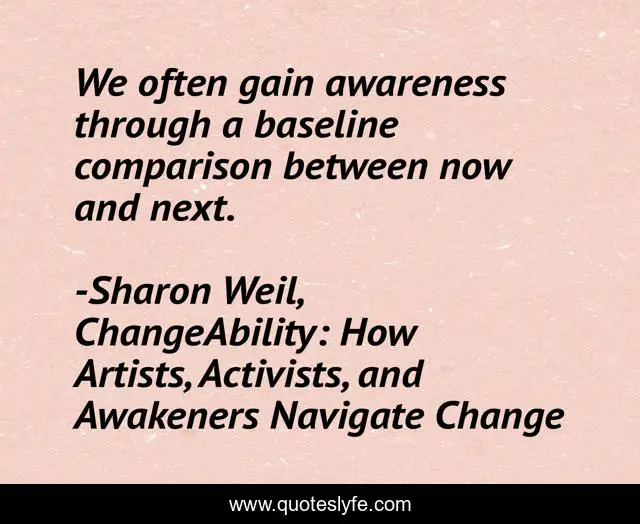 This page presents the quote "We often gain awareness through a baseline comparison between now and next.". Author of this quote is Sharon Weil, ChangeAbility: How Artists, Activists, and Awakeners Navigate Change. This quote is about comparison, be-the-change, sharon-weil, baseline, changeability, next, be-in-the-now, change, now,.