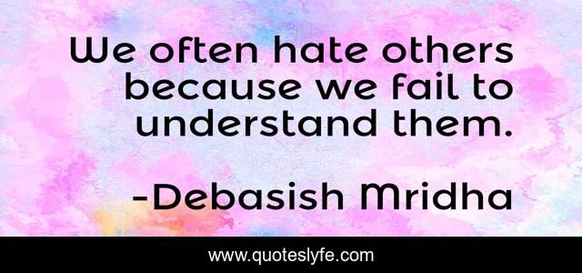 This page presents the quote "We often hate others because we fail to understand them.". Author of this quote is Debasish Mridha. This quote is about debasish, mridha, philosophy, debasish-mridha, hate-others, fail-to-understand, hate,.