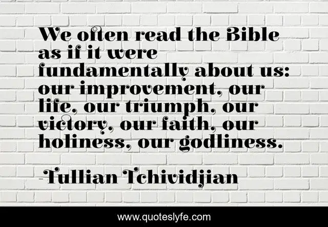 This page presents the quote "We often read the Bible as if it were fundamentally about us: our improvement, our life, our triumph, our victory, our faith, our holiness, our godliness.". Author of this quote is Tullian Tchividjian. This quote is about life, victory, improvement,.