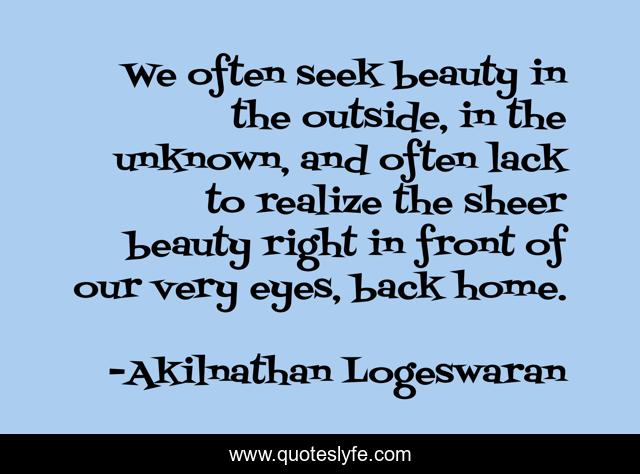 This page presents the quote "We often seek beauty in the outside, in the unknown, and often lack to realize the sheer beauty right in front of our very eyes, back home.". Author of this quote is Akilnathan Logeswaran. This quote is about beautiful, enjoy, beauty, enjoy-life, seeking, unkown, outside, home,.