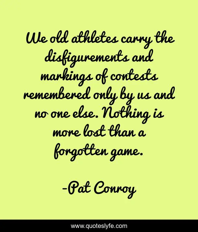 This page presents the quote "We old athletes carry the disfigurements and markings of contests remembered only by us and no one else. Nothing is more lost than a forgotten game.". Author of this quote is Pat Conroy. This quote is about basketball, sports-inspirational, sportsmanship, sports, game, athletes,.