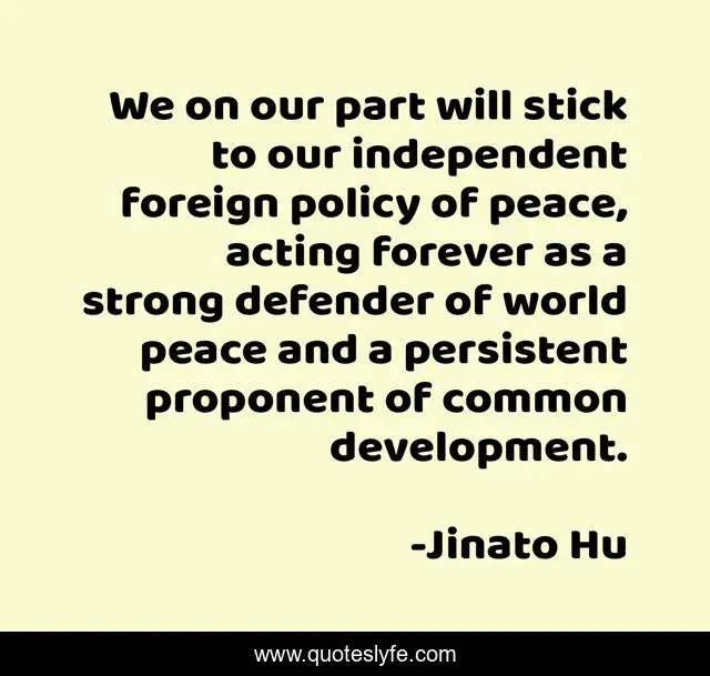 This page presents the quote "We on our part will stick to our independent foreign policy of peace, acting forever as a strong defender of world peace and a persistent proponent of common development.". Author of this quote is Jinato Hu. This quote is about world, acting, strong,.