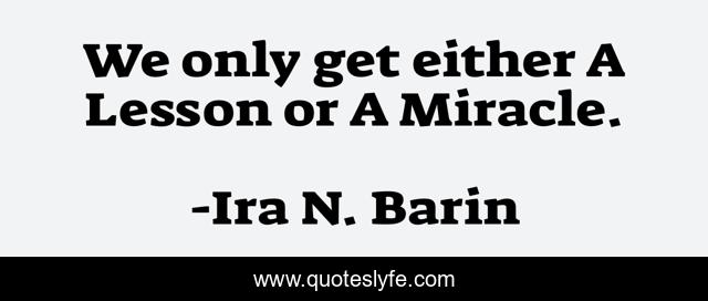 This page presents the quote "We only get either A Lesson or A Miracle.". Author of this quote is Ira N. Barin. This quote is about miracles, uncontrolled-situations, lessons-in-life, consequences, hope,.