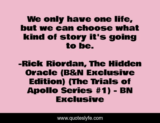 This page presents the quote "We only have one life, but we can choose what kind of story it's going to be.". Author of this quote is Rick Riordan, The Hidden Oracle (B&N Exclusive Edition) (The Trials of Apollo Series #1) - BN Exclusive. This quote is about human, choices,.