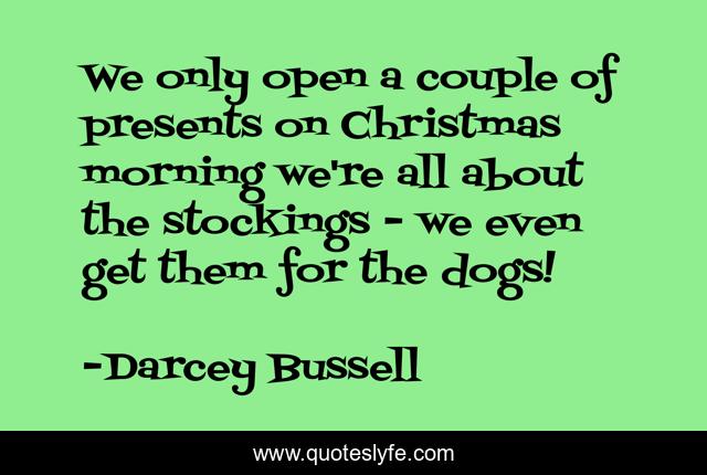 This page presents the quote "We only open a couple of presents on Christmas morning we're all about the stockings - we even get them for the dogs!". Author of this quote is Darcey Bussell. This quote is about open, dogs, morning,.