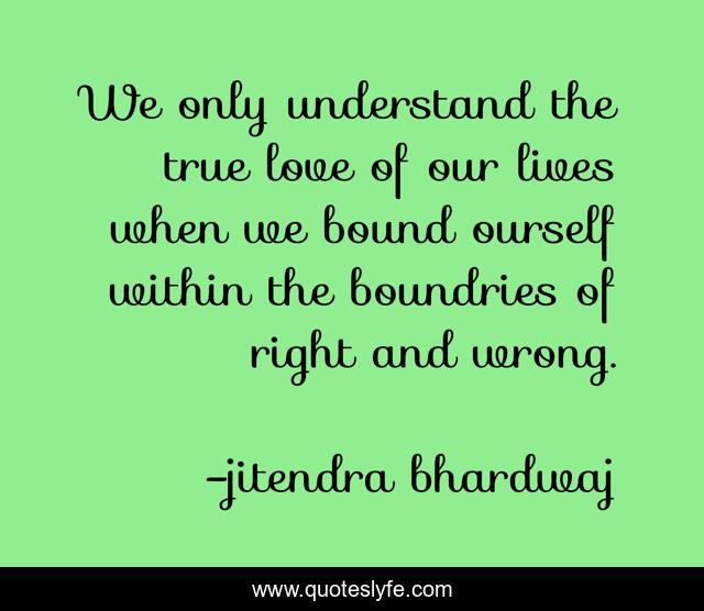 This page presents the quote "We only understand the true love of our lives when we bound ourself within the boundries of right and wrong.". Author of this quote is jitendra bhardwaj. This quote is about love, regret, sorrow, pain, seperation, affection,.